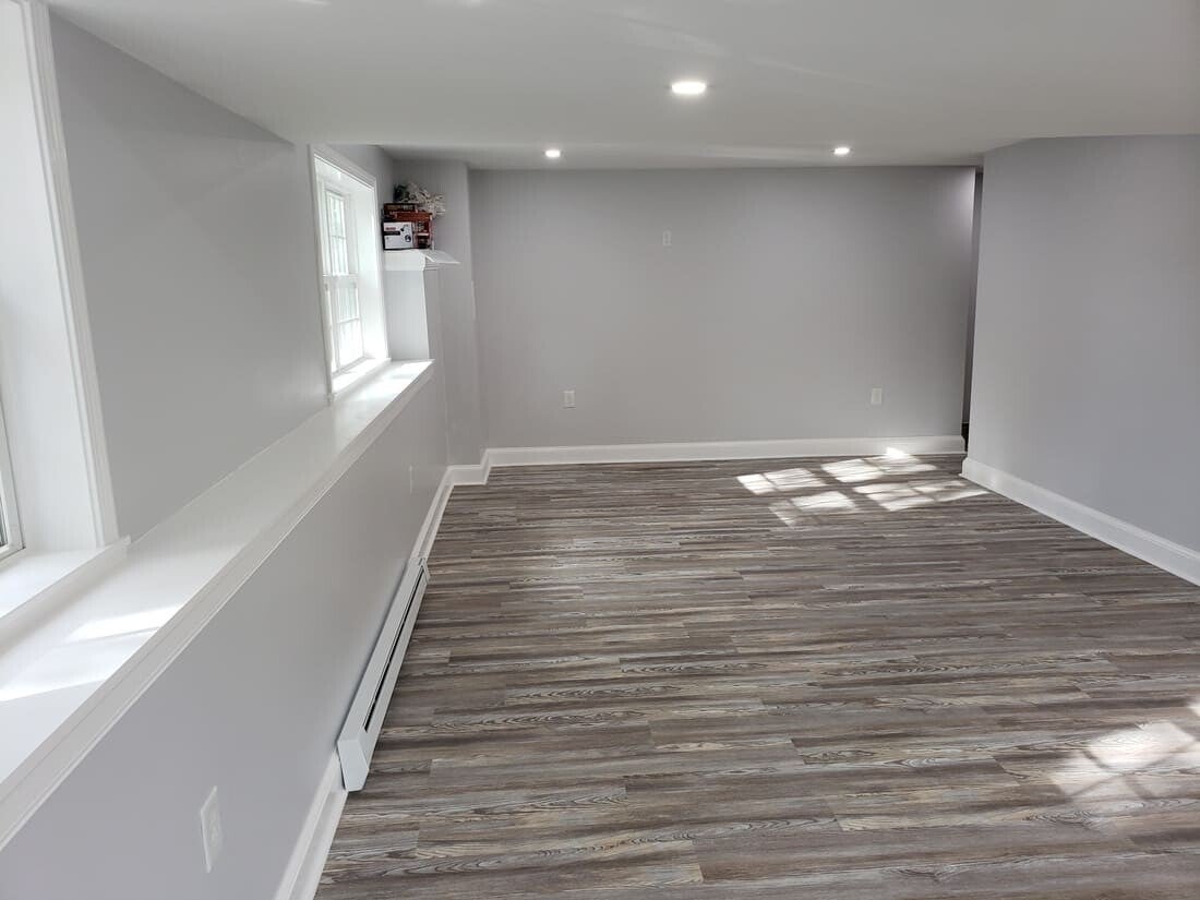 This basement in Wilmington, MA was transformed from a dark, damp, unusable space into a bright, dry, and fully functional living area. The remodel included waterproofing, new framing, insulation, electrical upgrades, drywall, flooring, custom trim, and fresh paint throughout. The finished space now features a comfortable family room, updated lighting, improved windows, and a modern layout that adds valuable square footage to the home.